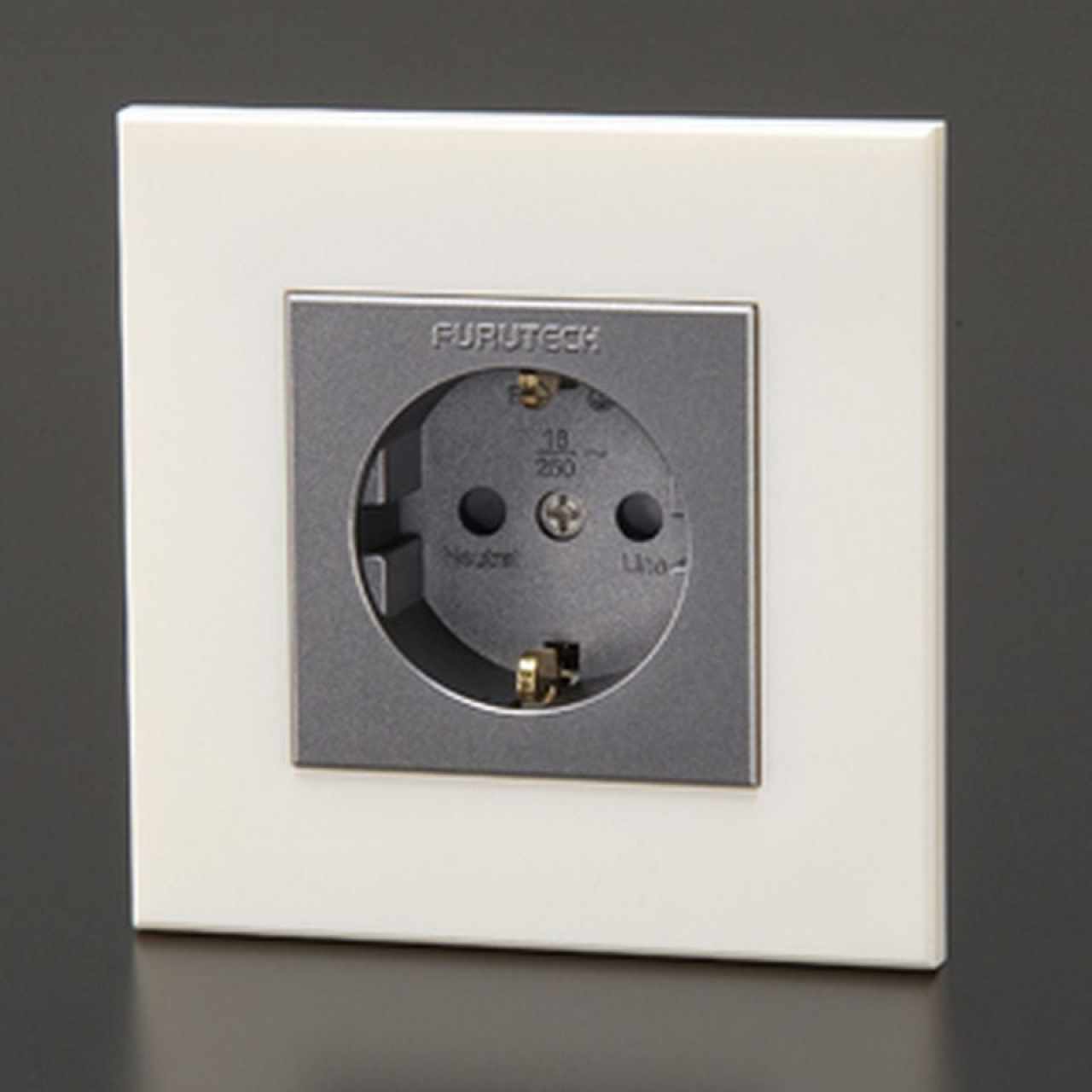 Furutech (fali) hálózati aljzat, nem mágnesezhető alpha rézből készült, 24K arany bevonatú érintkezőkkel.